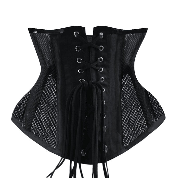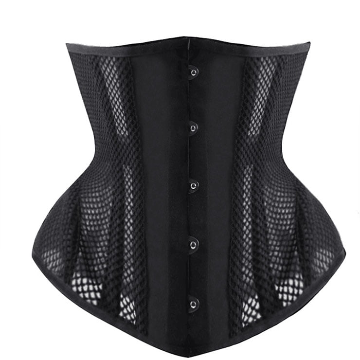 Corset features see-through mesh fabric, built-in 16 steel bones for flattening tummy, front 5 durable steel busk closure, back lace-up for cinching