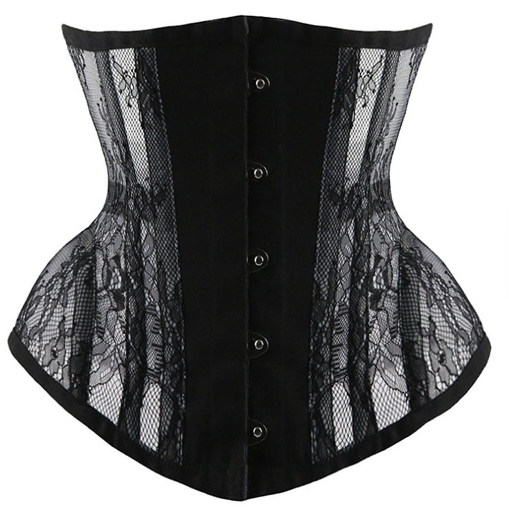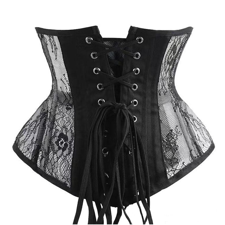 Corset features see-through lace fabric, built-in 16 steel bones for flattening tummy, front 5 durable steel busk closure, back lace-up for cinching
